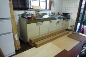 主な工事は古いキッチンの取り換え、玄関ホール~リビングの床の張替え、室内全般のリフォーム工事になります。
