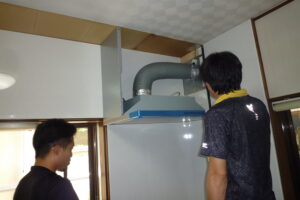 古いキッチンを撤去後、タイル張りの壁側面と後面に構造用合板をタイル全面の上にビス締めで施工。換気扇は壁付プロペラファンから屋外の風の影響を受けにくいシロッコファンにしてレンジフードに接続されたダクトを通して空気を屋外に排出します。