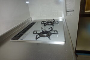 ガスコンロはY様の要望で2口コンロにしました。一般には3口が主流の様ですがあまり使わないし必要ないとのことでした。使い勝手も2口の方が広く使えて安全のようです。弊社の施工例をとっても意外と3口コンロは必要ないというお客様が多く見受けられます。