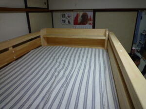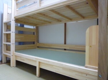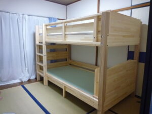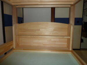 マットレス敷きではなく2段ベットですのでシングルの布団の寸法に合わせ作っています。特殊な金物は使用していないのでボルトを緩めると簡単に解体できるのが特徴です。