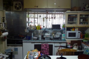 収納部分もシンクの下と調理台の下にあるのみで、開き戸が主流。したがって細かい物の収納には不便さがありました。流し台に収納が無い分窓上に吊戸棚を取り付けて収納を確保していました