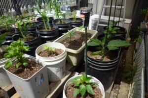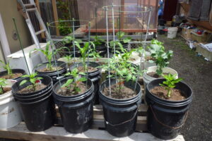 木炭塗料の入った容器には一苗ずつブロッコリー、シシトウ、パブリカ、トウモロコシを植えました。皆40cmほど伸びてきています。