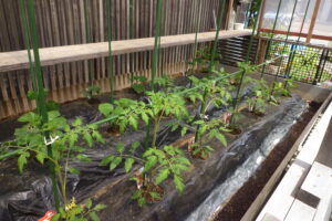8日に植え付けて今日で10日。一列目は中玉トマト、ミニトマト、ピーマン、シシトウなど7つの苗 5種類の野菜を植えています。背丈もトマトは50cmまで伸びて支えの横棒を超えました。他のピーマン、シシトウも25cmまで成長しています。2列目、3列目は主に種類の違ったキュウリを植えました。キュウリもつるが伸びてきました。後1週間たてば葉っぱも大きく成長し花も咲いてくるでしょう。