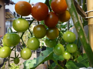 ミニトマトはブドウのように沢山収穫できます赤、黄色など品種もいろいろ出ているので見た目もきれいですね・・・毎日朝の食卓にサラダにして食べています。