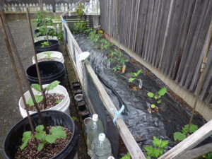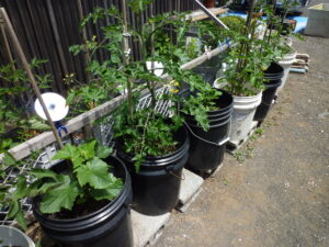 植えれば育つとおもって容器に植えた野菜が大変なことに? 経験を積んで覚えることもたくさんあります。底の深い容器に植えると根が容器いっぱいに広がりキュウリなどのつるが伸びる野菜は縦、横に伸びて管理が大変なことがわかりました。